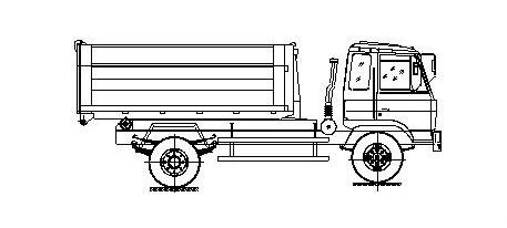 步驟3.當拉臂鉤鉤到箱體彎鉤時,繼續推下拉臂操作手柄到落下位置,使垃圾箱體繼續上車(注意:保證垃圾箱體的縱梁位于附車架尾部兩后滾輪之間);如圖: