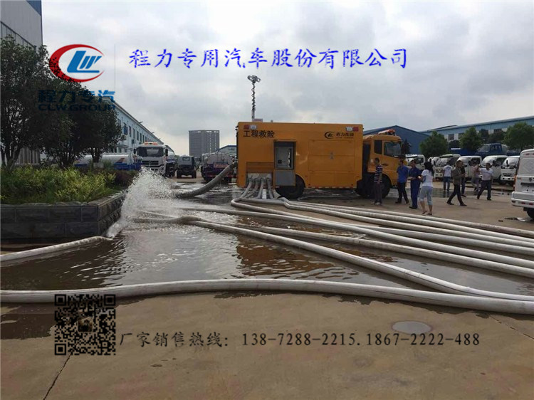 選裝配置:選裝行李架、爬梯、車頂工作臺;選裝不同形狀、結(jié)構(gòu)的警示燈;選裝中隔斷(可選擇開門)、車身兩側(cè)可選開上掀門、盲窗、側(cè)開門;花紋鋁板;加裝設(shè)備工具柜、配電箱、發(fā)電機組、水泵、電焊機、空壓機等線路安裝外接電源系統(tǒng)、(室內(nèi)燈光照明、探照燈、高桿照明燈等);繞線盤,還可根據(jù)用戶不同需求加裝不同的維修搶險設(shè)備、車身制作專用圖案或標識。 東風天錦工程救險車、抗洪救災(zāi)車,搶險車,抗洪吸水車,抗旱車 程力專用汽車股份有限公司最新研發(fā)的搶險救援車,工程搶險車,抗洪吸水車,應(yīng)急電源泵車,移動水泵車。該車排水量1000立方/小時,操作簡單,機動性強,真正實現(xiàn)了移動水泵的概念,設(shè)備可滿足緊急排水搶險的需要,并具備移動電源功能。 設(shè)備采用東風底盤改裝,總質(zhì)量12.5噸,發(fā)動機功率127kw,排放標準達到國五標準,3.8米軸距,帶空調(diào),方向助力,最大涉水深度600mm。 發(fā)電機備用功率120kw,額定輸出功率110kw,額定頻率50HZ,額電壓230/240V,康明斯發(fā)動機。電子調(diào)速,啟動電瓶,電瓶總閘。 車廂內(nèi)專設(shè)接地樁頭,連接方便,在機組工作時,連接接地線,保護作業(yè)安全。機電設(shè)備有嚴密的防漏電保護措施。 控制系統(tǒng)采用智能控制,集中控制,中文界面,具有自動障礙保護功能,選用優(yōu)質(zhì)電器元件,性能穩(wěn)定,安全可靠。 該車配備一臺一體式真空輔助自吸排污泵,流量1000立方/小時,電機功率55kw,揚程12米,吸程8米,安裝在車尾部,方便拆卸水管及出水,該泵無需灌水,無需額外增加水環(huán)泵輔助抽真空,性能好,出水快,水泵啟動采用軟啟動。抽水管為兩個八寸管,采用美國進口透明水管,質(zhì)量輕,拿取方便,配3.5米長水管4根。接頭都采用東方式快速接頭,使用方便,密封效果好,每個進水口配置鴨嘴式接頭,實現(xiàn)低水位抽吸作業(yè)。各進水口配90度彎頭。 排水口分為4個5寸出水口,每個出水口66米出水軟管,(33米每卷)軟管為快速接頭連接,操作方便,并在接頭出設(shè)有防松保險裝置,安全可靠。材質(zhì)為雙面PVC,耐磨,耐壓。 發(fā)電機組:發(fā)動機備用功能120KW額定輸出功率110KW,額定頻率50HZ,額電壓230/400V,康明斯發(fā)動機,調(diào)速方式:電子調(diào)速,啟動電瓶,電瓶總閘