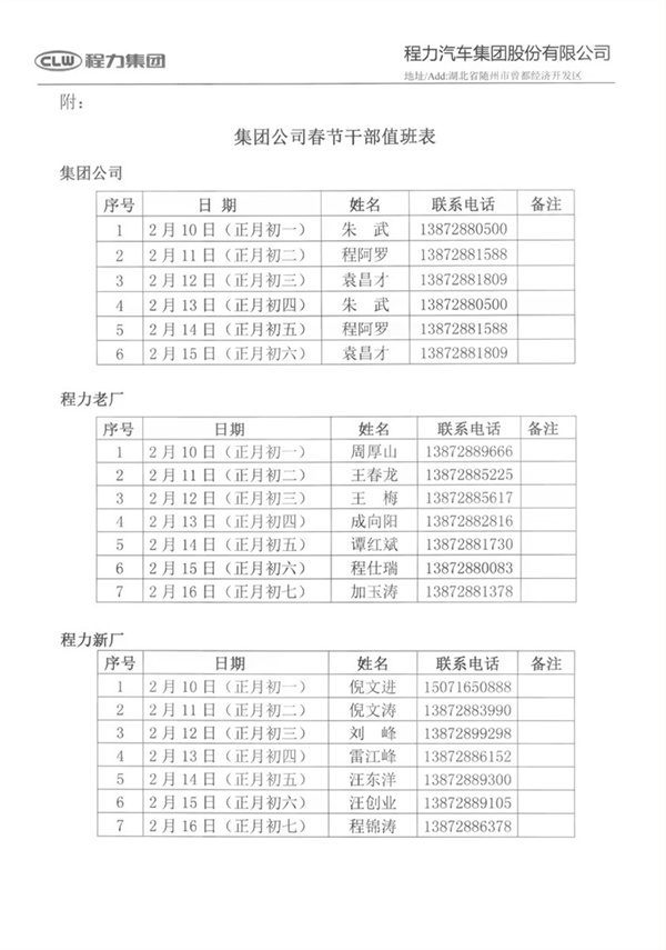 程力汽車集團(tuán)股份有限公司關(guān)于2024年春節(jié)放假的時(shí)間及“凝心聚力謀發(fā)展奮發(fā)有為奔 一流”網(wǎng)絡(luò)直播年會(huì)暨總結(jié)表彰大會(huì)的通知 程力集團(tuán)公司全體員工: 根據(jù)國(guó)務(wù)院辦公廳2024年放假有關(guān)規(guī)定,現(xiàn)將程力汽車集團(tuán)公司2024年春節(jié)放假安排通知如下: 一、2024年春節(jié)放假時(shí)間 2月7日--2月8日按星期六、日作息時(shí)間上班; 2月9日各子公司、職能部門根據(jù)工作需要安排人員值班; 2月10日(正月初一)一-2月15日(正月初六)放假,共六天。 二、2024年春節(jié)放假工作安排及相關(guān)要求 1.各單位、部門要做好節(jié)前安全檢查和清潔掃除工作,集團(tuán)綜合檢查組將對(duì) 新老廠區(qū)辦公室、生產(chǎn)車間等區(qū)域進(jìn)行安全大檢查。 2.節(jié)假日期間若遇突發(fā)事件發(fā)生,要妥善處置并及時(shí)報(bào)告;全體員工須保持手機(jī)開(kāi)機(jī)狀態(tài),釘釘在線,確保聯(lián)系暢通。 3.全體員工請(qǐng)于2月16日(正月初七)上午9:00準(zhǔn)時(shí)報(bào)到,2月17日(正月初八)正式上班,無(wú)故未到者,將作自動(dòng)離職處理。 4.公司倡導(dǎo)廣大員工春節(jié)期間加強(qiáng)個(gè)人防護(hù),共同度過(guò)一個(gè)平安祥和的春節(jié)! 三、召開(kāi)網(wǎng)絡(luò)直播年會(huì)暨總結(jié)表彰大會(huì)時(shí)間及相關(guān)要求 1.于2024年2月4日(臘月二十五)上午9:18分整在老廠6號(hào)樓2樓會(huì) 議室召開(kāi),請(qǐng)參會(huì)人員于8:50前進(jìn)場(chǎng),年會(huì)以線上+線下模式舉行。 2.請(qǐng)收到年會(huì)現(xiàn)場(chǎng)入場(chǎng)券的集團(tuán)中高層、五大生產(chǎn)體系成員代表、十大銷售體系成員代表,統(tǒng)一著工作服(由于當(dāng)天氣溫較低大家?guī)虾竦耐馓?,憑入 場(chǎng)券入場(chǎng)。 3.不能參加現(xiàn)場(chǎng)年會(huì)的同事,關(guān)注程力集團(tuán)抖音發(fā)布官方號(hào):CLJTDYGFH001 觀看直播。 提前祝大家春節(jié)愉快、身體健康、萬(wàn)事順意!附圖: ![]() ![]() ![]() ![]() |