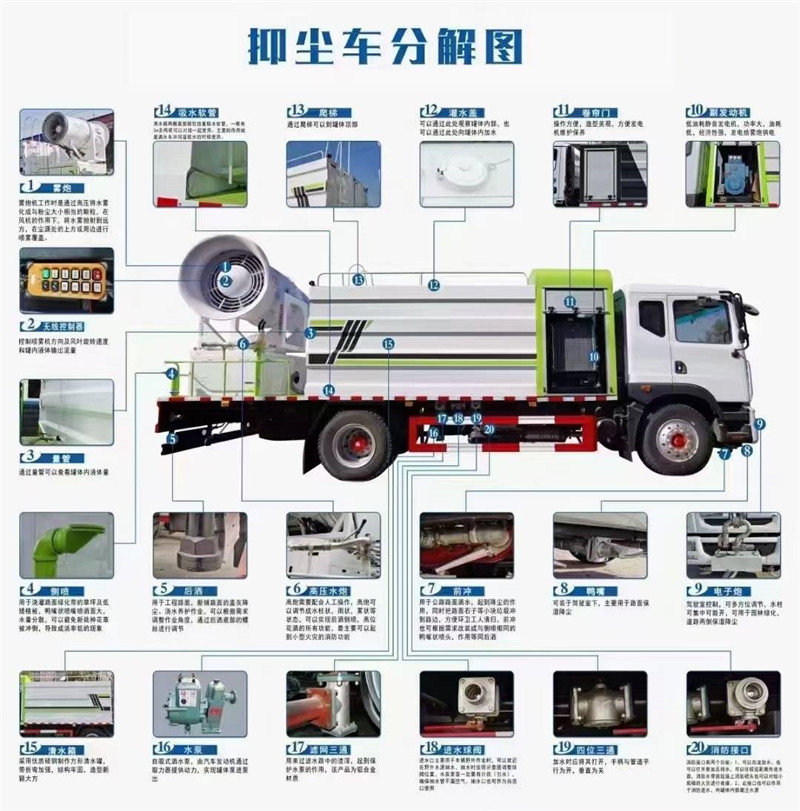 湖北程力抑塵車霧炮車簡介湖北程力抑塵車的別名也叫程力霧炮車因為其外形結(jié)構(gòu)是尾部有一輛巨炮,所以霧炮車這個稱呼知名度會更高一些。我們需要先了解霧炮車是由電機、高壓風(fēng)機、水平旋轉(zhuǎn)裝置、仰角控制裝置、導(dǎo)流筒、霧化噴嘴、高壓泵、儲水箱等主要部件組成。霧炮車也是在二類汽車底盤的基礎(chǔ)上經(jīng)過了霧炮車廠家的改裝而成的。霧炮車的結(jié)構(gòu)主要是汽車底盤、水罐、電控系統(tǒng)、和霧炮機幾大部分。圖中具體標(biāo)識了各主要部件例如高端舒適性汽車底盤、壓力表及鍍鋅管道、變頻節(jié)能智能控制裝置、進(jìn)口品牌高壓噴霧泵、無線遙控器、低油耗靜音發(fā)電機、大容量潔凈水箱、雙層風(fēng)葉大風(fēng)壓風(fēng)機、風(fēng)送式遠(yuǎn)程噴霧機、高效霧化噴嘴、等主要部件的大致位置和布局,這也是一個霧炮車的組成結(jié)構(gòu)的主要組成部分。 電機的作用是帶動高壓泵工作,把儲水箱的水吸出來,并進(jìn)行加壓,再輸送到碰頭處。導(dǎo)流筒和強風(fēng)導(dǎo)流裝置是把風(fēng)機的強風(fēng)氣流集合定向并強力噴出,目的是把水霧噴向遠(yuǎn)處。 霧化噴嘴是由多個組成的,把壓力機傳輸過來的水分霧化后,借助強風(fēng)氣流噴射出去。高壓泵是從發(fā)電機取力,給泵提供動力,帶動導(dǎo)流筒等裝置的工作。 程力抑塵車是通過噴灑抑塵固化劑等噴灑液實現(xiàn)抑制揚塵污染的特種車輛,是湖北程力集團(tuán)自主研發(fā),主要服務(wù)于鐵路、道路及其它粉塵高發(fā)場所。在構(gòu)造上,抑塵車主要是由擺臂式噴灑裝置、儲液罐、自行運載車輛及控制系統(tǒng)組成。抑塵車在冬季的北方地區(qū)罐體、噴淋嘴、泵體需要加裝保溫加熱系統(tǒng),才能正常作業(yè)。程力多功能抑塵車適用范圍:“霧炮車最早用于碼頭、工礦和煤場,那里的污染物顆粒較大,對水霧的要求沒這么精細(xì)。通過高壓將水霧化成微米級的水霧顆粒,與粉塵顆粒物大小相當(dāng),不僅可以省水,還能與城市中的霧霾碰撞、吸附,凝結(jié)成粉塵團(tuán)并沉降。” 當(dāng)與電源有關(guān)的安全蓋或部品被移動或高電壓端子露出時,請勿操作噴霧機。 噴霧機在運轉(zhuǎn)中,因任何理由導(dǎo)致停止,必須排除故障后才可再重新啟動,如果在運轉(zhuǎn)中感覺有異常時,應(yīng)迅速停止噴霧機,并請教責(zé)任擔(dān)當(dāng)者。經(jīng)常檢查手持遙控發(fā)射器的天線,確保正確連接不能松動,否則遙控器不能正常工作。注意手持遙控器防止進(jìn)水,如有進(jìn)水請立即取下電池,待處理后在使用。在視線不佳時,禁止使用遙控器。 噴霧用水要清潔,不要用帶沙質(zhì)和泥質(zhì)混水作噴霧用水。嚴(yán)禁泥沙、雜物進(jìn)入水箱,以免堵塞管道、噴頭或損壞柱塞泵。若遇噴頭堵塞或漏液,應(yīng)關(guān)閉噴液開關(guān)或停機清理排除。噴霧作業(yè)結(jié)束后,必須排凈機內(nèi)積水,特別是在溫度低,容易結(jié)冰的地區(qū),不使時必須徹底排凈機內(nèi)積水,以免凍裂設(shè)備和管道。 |